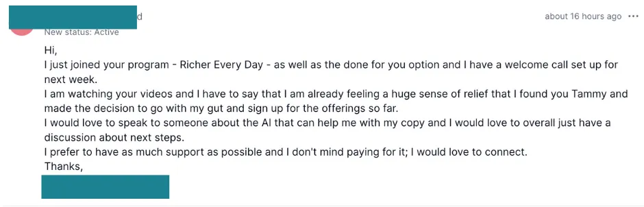 Inside of Richer This Month, I give you everything - the curiosity hook that drives your dream clients to raise their hands; the two sentence Rapid Response Copy Template; my surprising highest-converting graphic template; the complete step-by-step simple set-up guide to get it ONLY in front of your best clients...